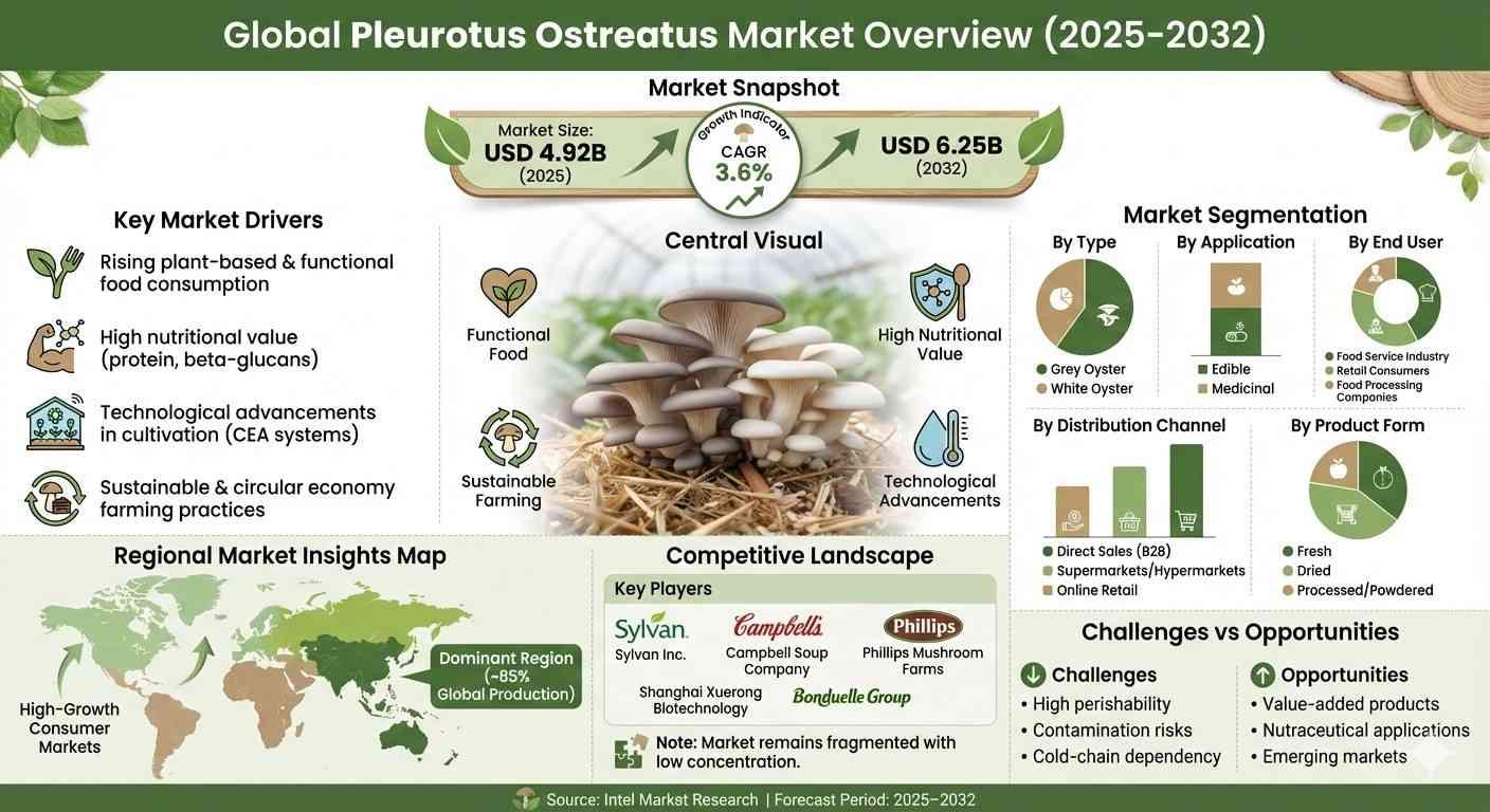 global Pleurotus Ostreatus market was valued at USD 4.92 billion in 2025 and is projected to reach USD 6.25 billion by 2032, growing at a steady CAGR of 3.6% during the forecast period. Market growth is primarily driven by rising global demand for alternative protein sources, increasing consumer awareness of nutritional and medicinal benefits, and technological advancements in mushroom cultivation practices. The expanding adoption of plant-based and functional foods, coupled with sustainable cultivation using agricultural waste substrates, is further strengthening market expansion across both developed and emerging regions.