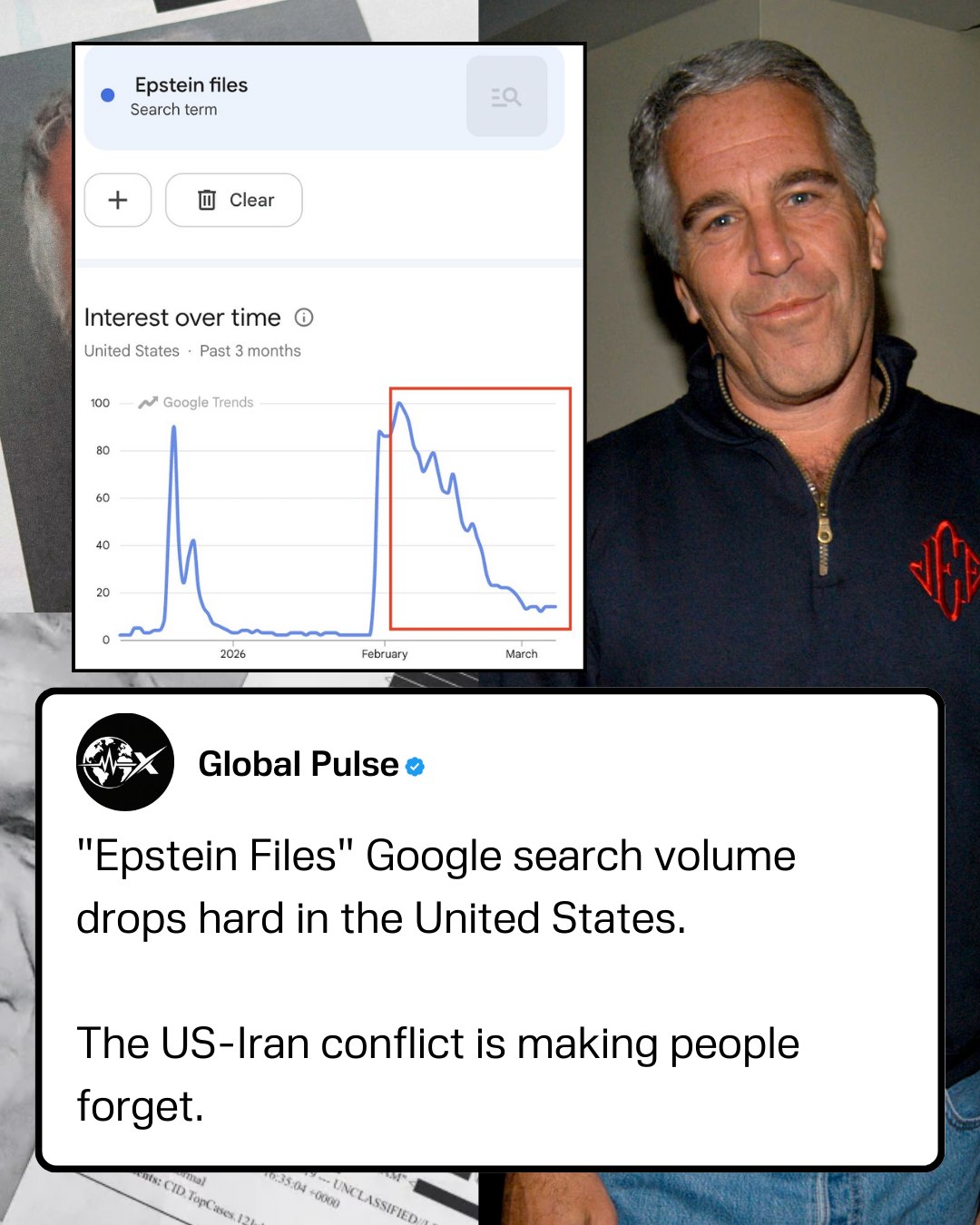 • New data shows public interest in the “Epstein Files” has plummeted in the United States just as the U.S.–Israel conflict with Iran began dominating headlines. According to Google Trends, searches related to the Epstein documents — which include millions of pages of court records and interview summaries released under the Epstein Files Transparency Act — have fallen sharply as attention shifts to the war and its global implications.