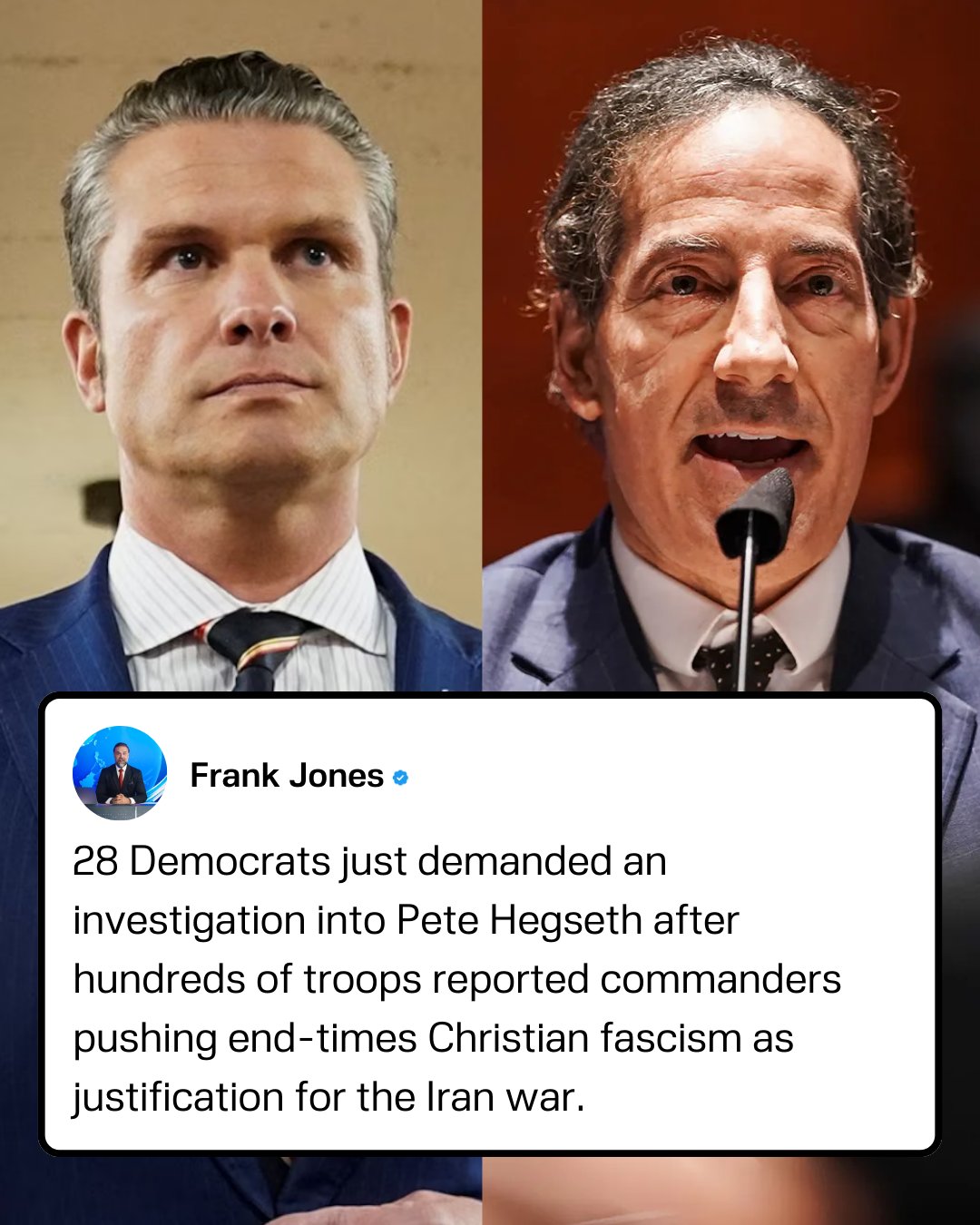 • More than two dozen House Democrats — led by Jared Huffman and Jamie Raskin — are demanding a formal investigation into Pete Hegseth after hundreds of U.S. service members reportedly complained that military commanders were promoting end-times Christian ideology as justification for the war with Iran.