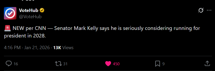 Senator Mark Kelly says he is seriously considering running for president in 2028