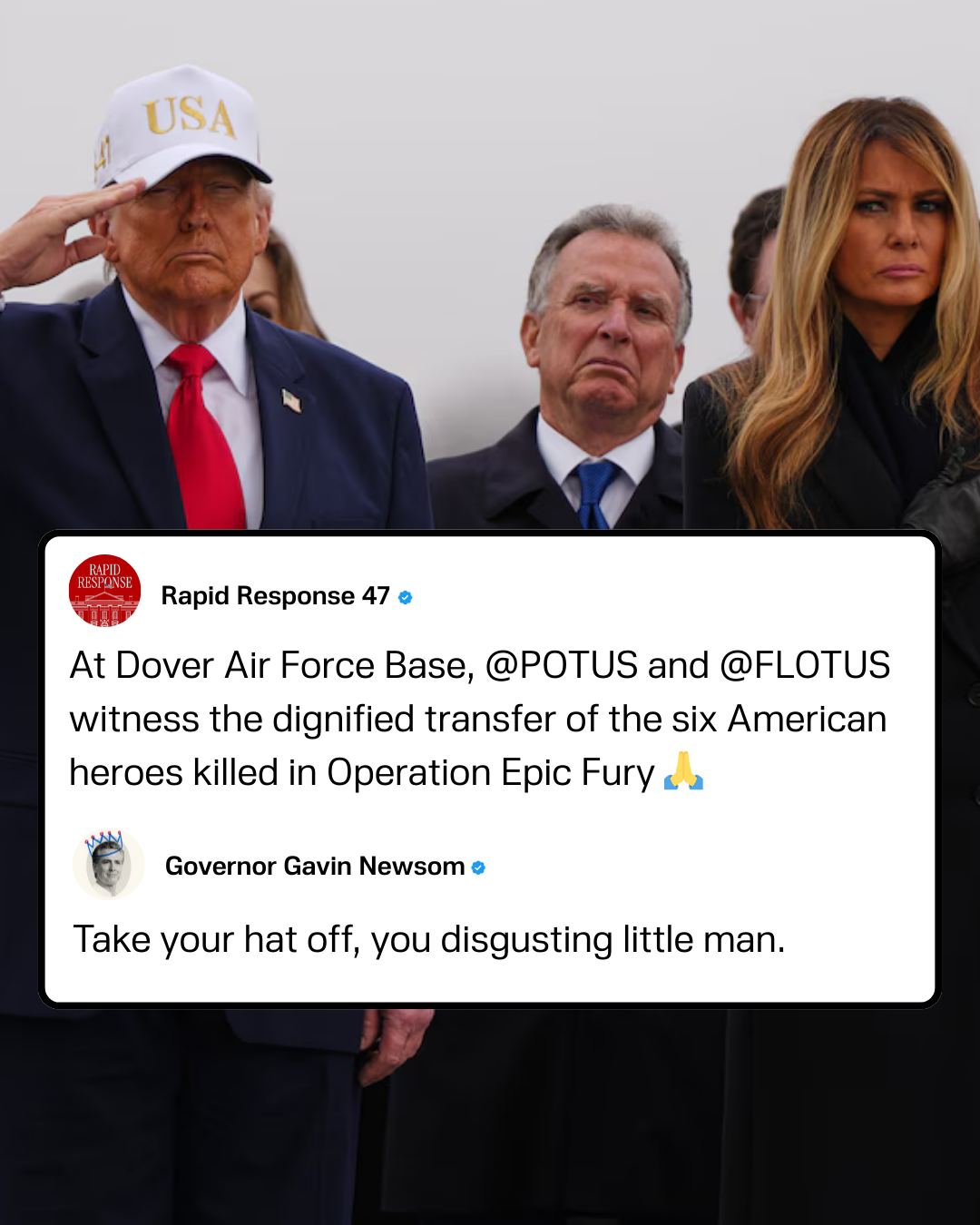 California governor Gavin Newsom has called President Donald Trump a “disgusting little man” after he kept his hat on at Dover during the dignified transfer of the six soldiers who lost their lives.