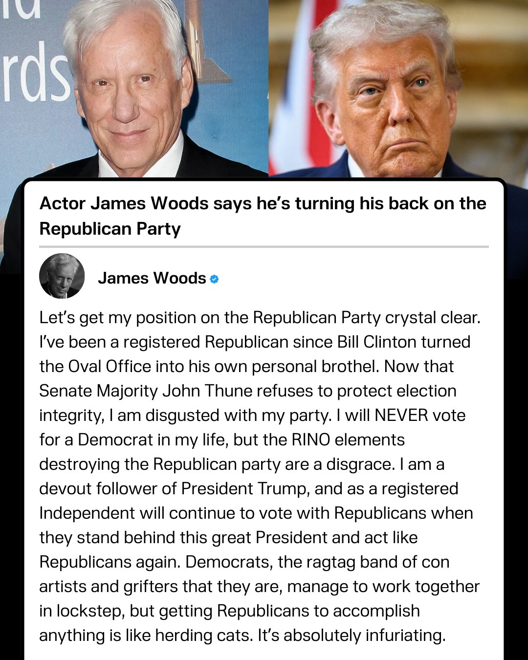 Actor James Woods says he’s leaving the Republican Party — blasting GOP leadership while reaffirming his loyalty to Donald Trump. In a lengthy post, Woods said he’s been a registered Republican “since Bill Clinton turned the Oval Office into his own personal brothel,” but is now “disgusted” with the party after accusing Senate Majority Leader John Thune of refusing to protect election integrity. Woods says he will register as an Independent, though he added he will still vote with Republicans when they “stand behind this great President and act like Republicans again.”