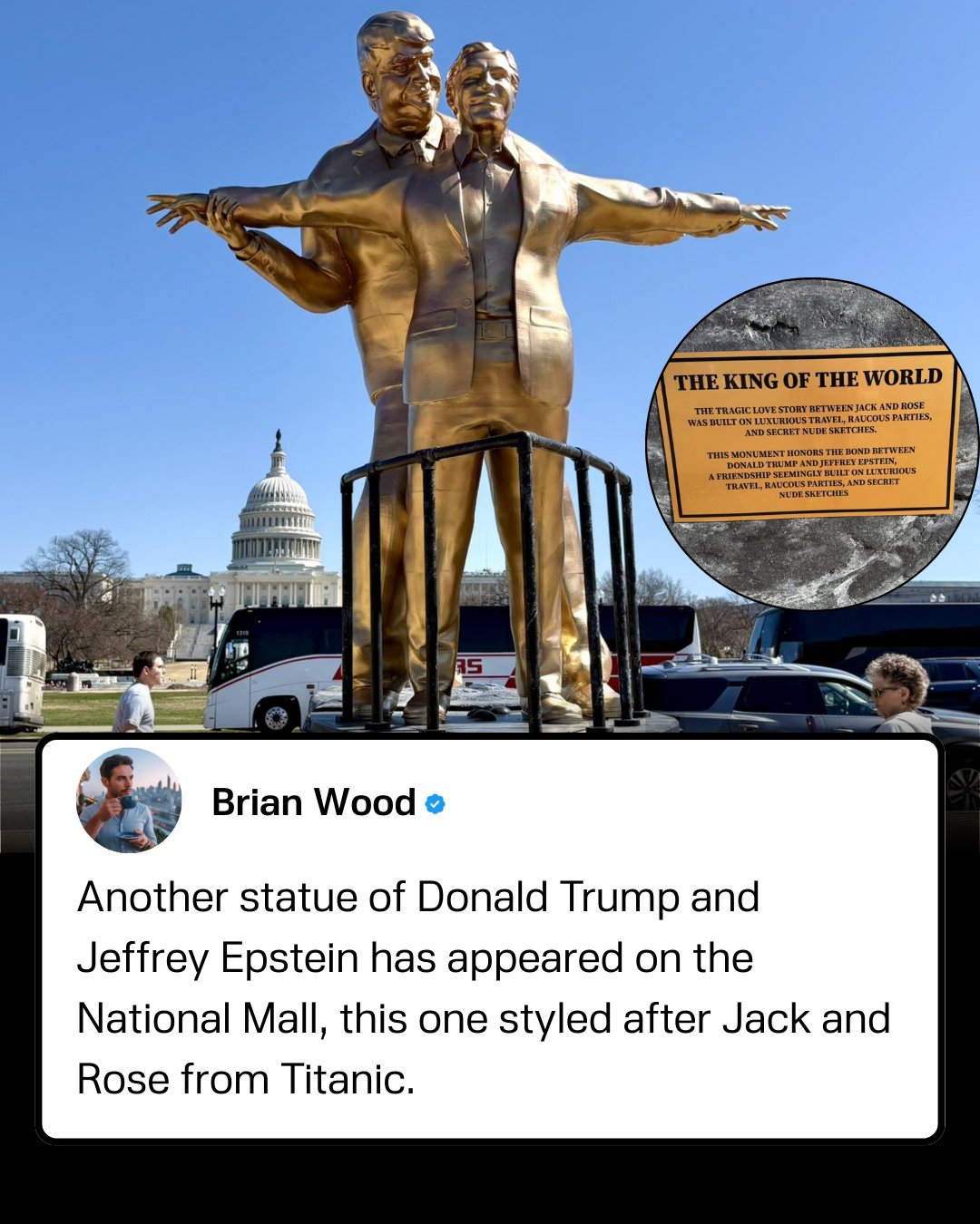 A new statue of President Donald Trump and Jeffrey Epstein has appeared on the National Mall in Washington D.C, and they left a message for Trump on the back... "THE KING OF THE WORLD" "The tragic love story between Jack and Rose was built on luxurious travel, raucous parties, and secret nude sketches." "This monument honors the bond between Donald Trump and Jeffrey Epstein, a friendship seemingly built on luxurious travel, raucous parties, and secret nude sketches"