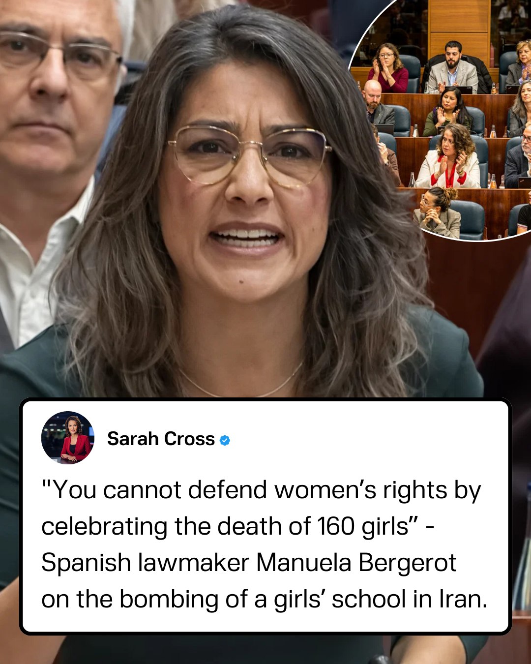 • Spanish lawmaker Manuela Bergerot sharply condemned the use of women’s rights to justify the war in Iran, saying in a public speech, “You cannot defend women’s rights by celebrating the death of 160 girls.”