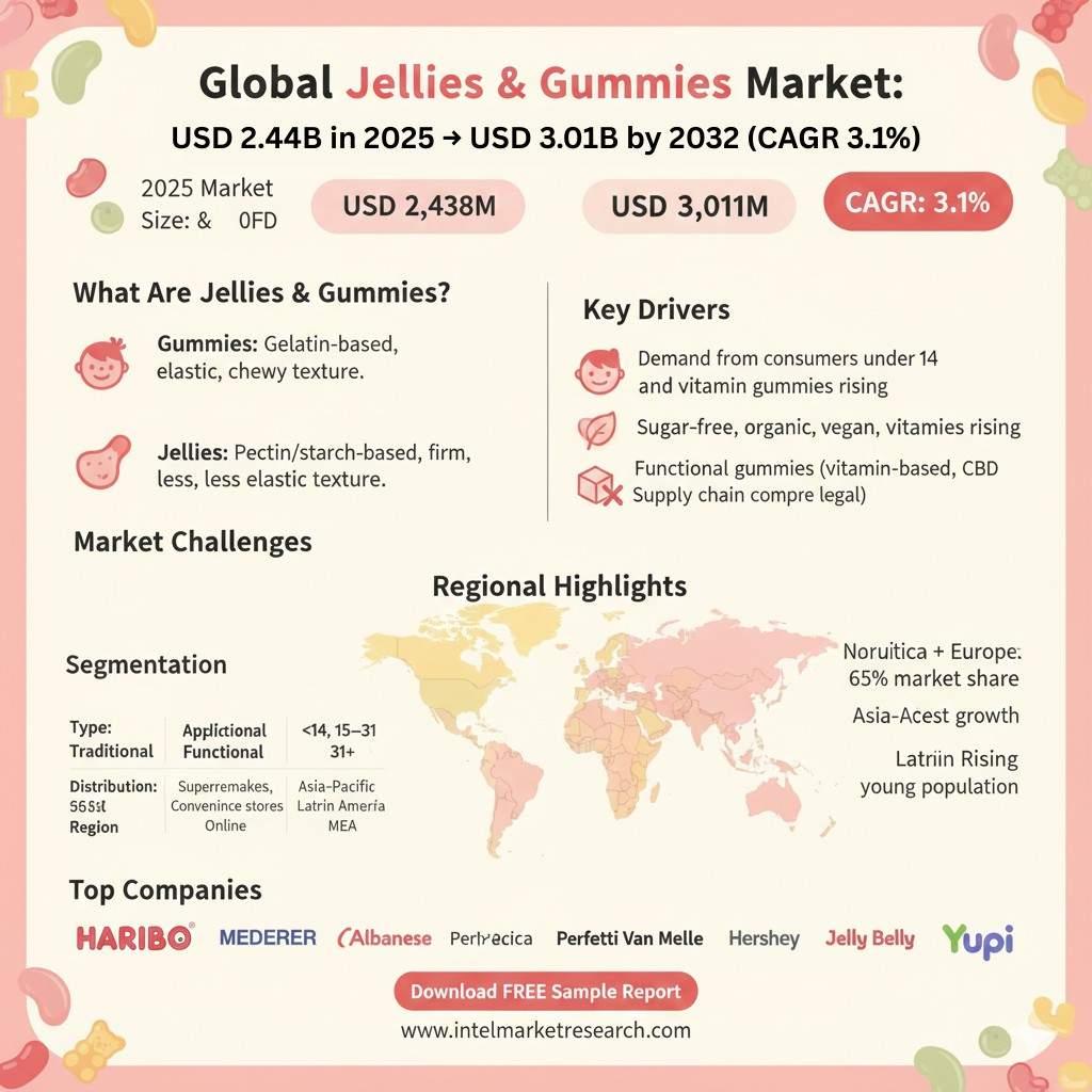 Global Jellies and Gummies Market, valued at USD 2,438 million in 2025, is projected to reach USD 3,011 million by 2032, growing at a steady CAGR of 3.1%. Market expansion is driven by consistent demand from children and young adults, continuous product innovation, and the rising adoption of functional, plant-based, and clean-label confectionery. Jellies—made using carbohydrate-based gelling agents like pectin or starch—and gummies—gelatin-based, elastic-textured candies—play a major role in traditional sweets as well as emerging functional categories such as vitamin gummies, vegan gummies, and wellness-infused products. With strong presence in North America and Europe, and rapidly growing opportunities in Asia-Pacific and Latin America, the sector shows stable, long-term potential supported by premiumization, health-focused reformulation, and digital retail expansion.